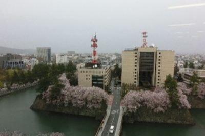 県庁南側の明治安田生命福井ビル上階から桜満開の城址を眺望して感動