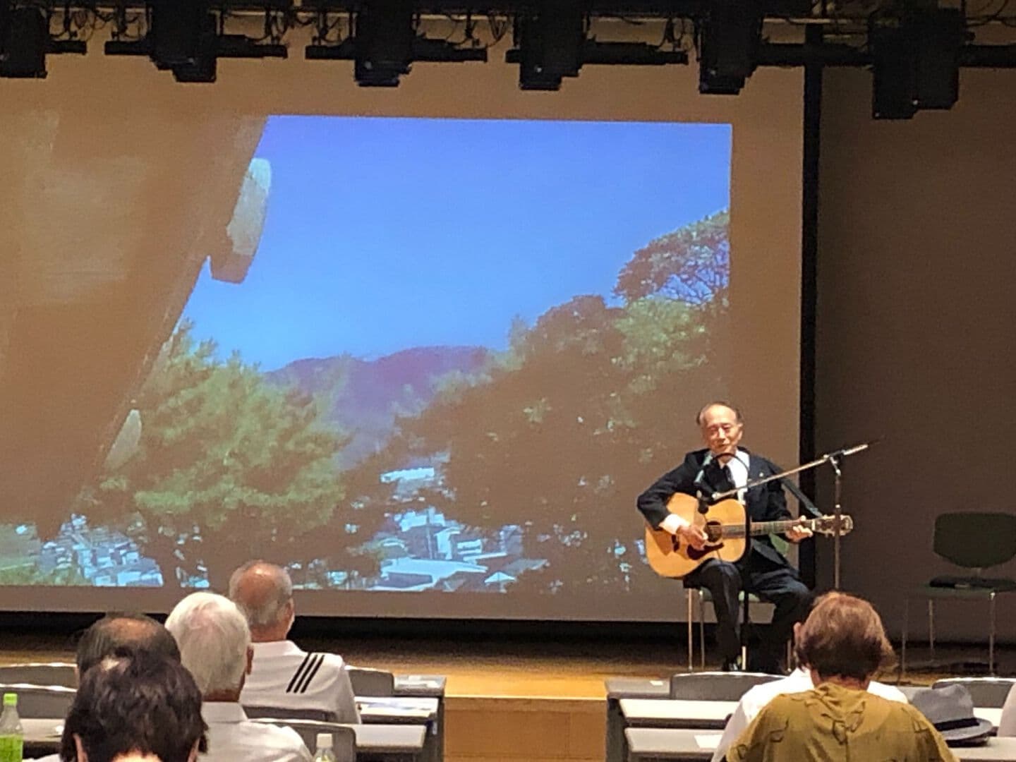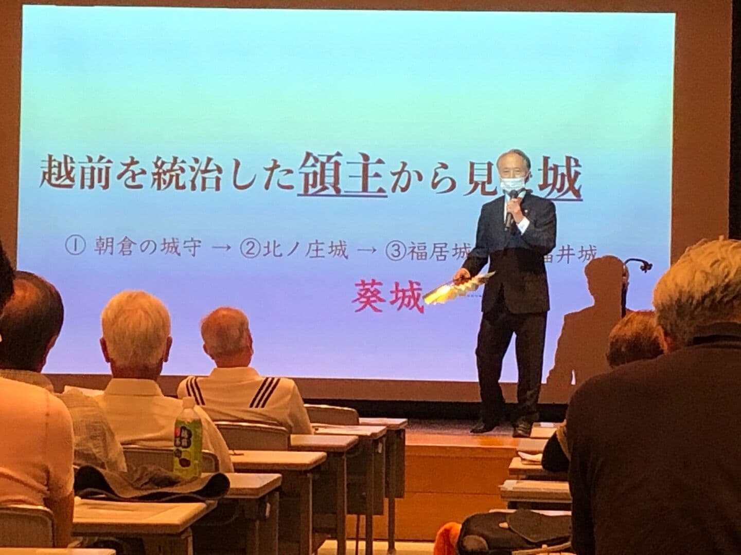 栗田元知事、酒井元福井市長のお祝いの言葉!県交通まちづくり課 田辺毅主任のヒツジサル櫓と土塀の説明に感謝。全て議案審議可決。会員拡大の意見もその後「葵城」について櫻川幸夫さんの講演!ギター抱えて登場、歴史を語る素晴らしい!余りの詳しい歴史とギターの器用さに感銘、感動。