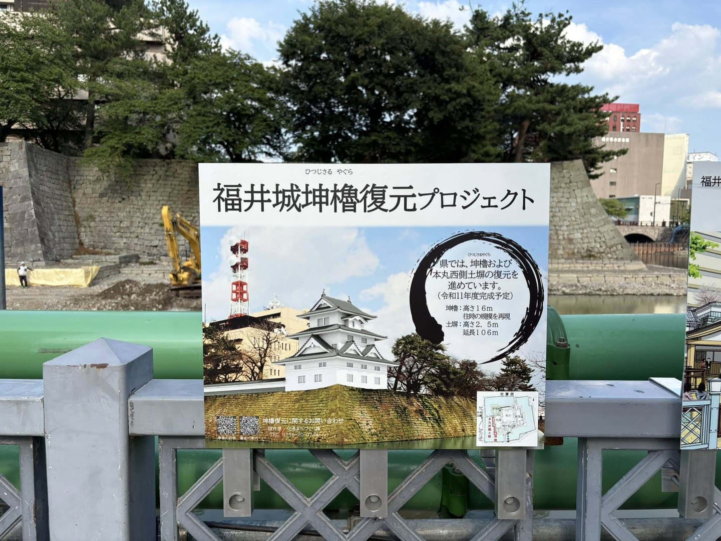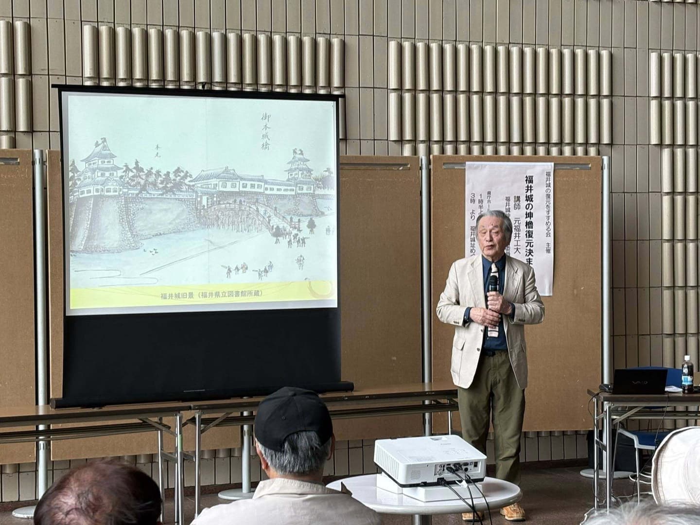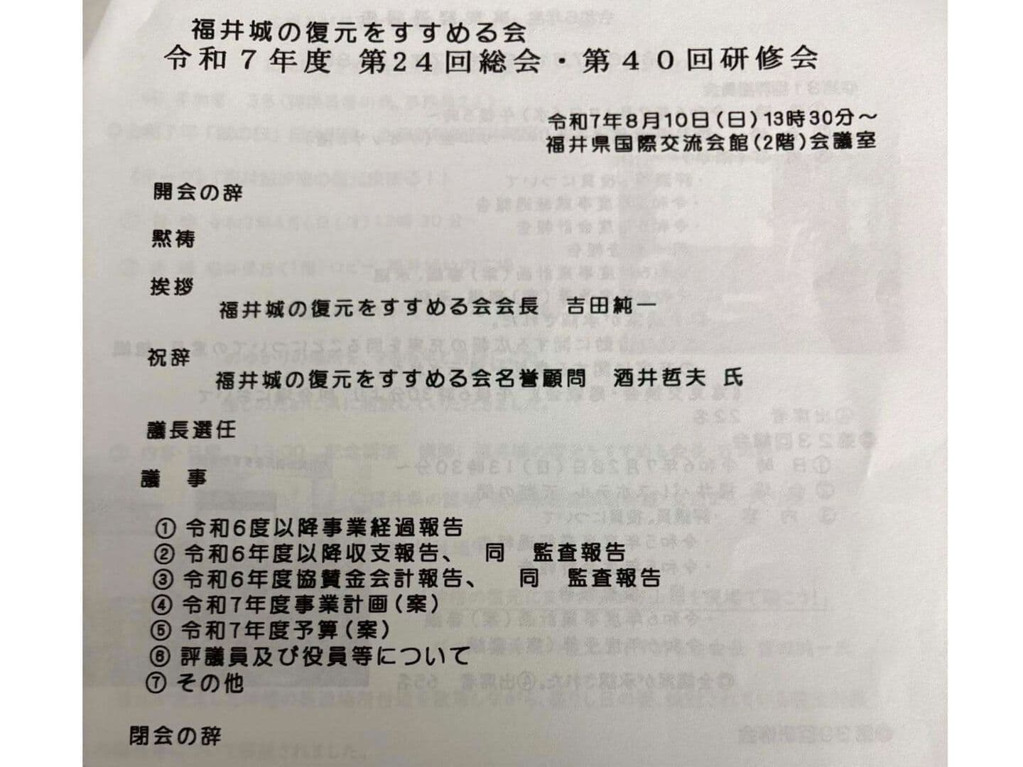 令和7年度の福井城の復元をすすめる会の総会・研修会が開催されました。総会が終了次第、坤櫓復元整備事業委員長である吉田純一会長が講師となり講演会を開催。テーマは「福井城坤櫓の復元決まる!」高さ16m、三重の櫓、工費は約40億円、完成は令和11年度予定という計画構想。すでに、令和5年から調査、実施設計が始まり、現在お堀の水を少なくして重機が入ってきています。県民の長年の念願である櫓の建設、待ち遠しいです。