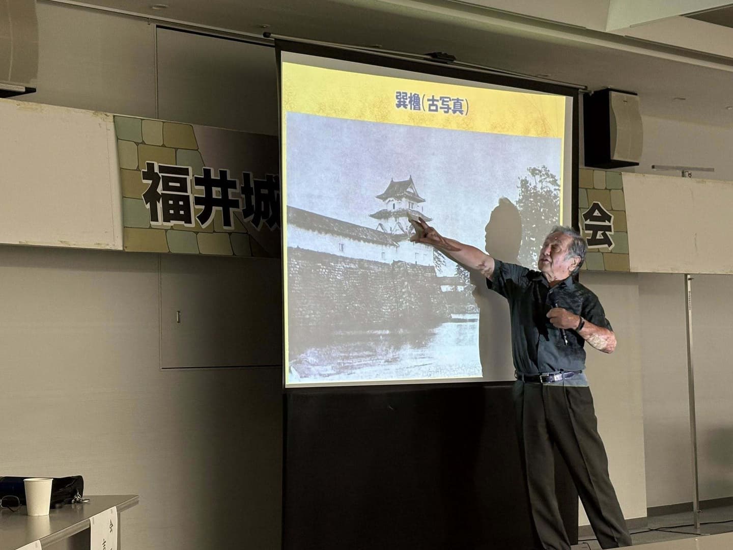 演題「福井城址坤櫓の復元決まる!!」講師は元福井工大教授そして坤櫓復元整備検討委員会委員会長、吉田純一先生です大変詳細な事がよくわかり、ますます復元に向けて期待感が高まりました講演のあとは、実際に坤櫓があった場所のふもとに行き、高さや大きさ、また周りの石垣のはらみなど皆で確認しあいながら、有意義な時間を体験しました。